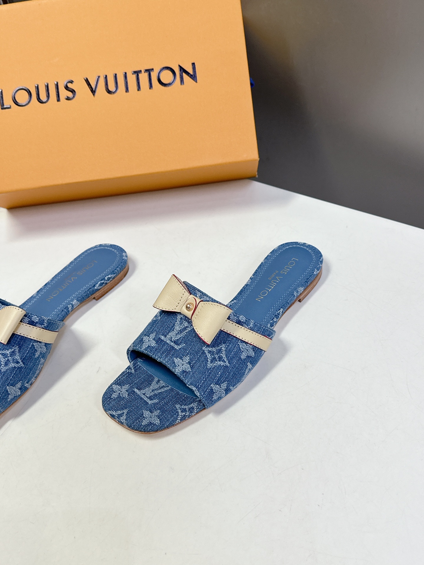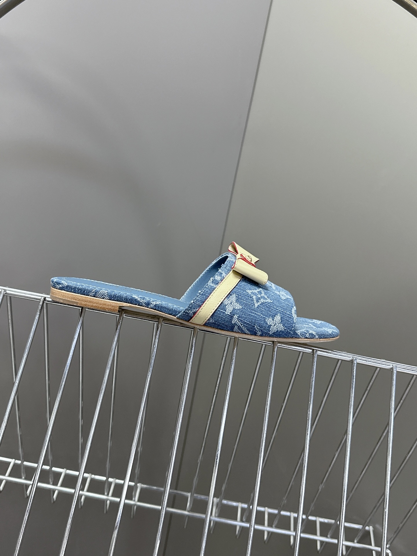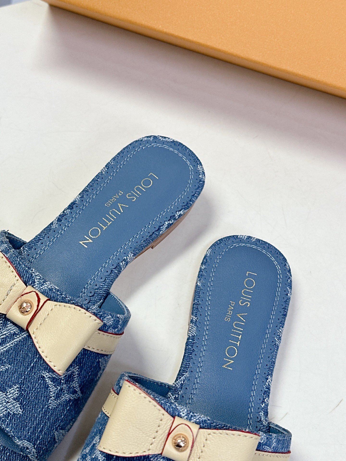 LOUIS VUITTON LV DENIM BOW SLIDES BLUE CALFSKIN LEATHER SANDALS MASTER QUALITY