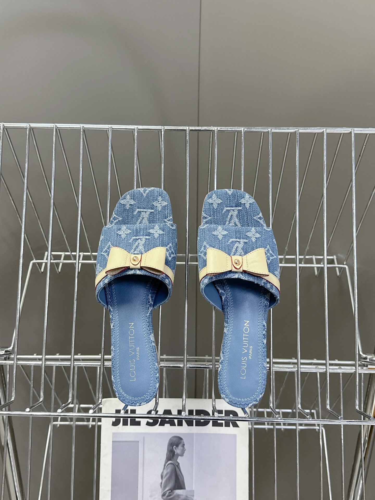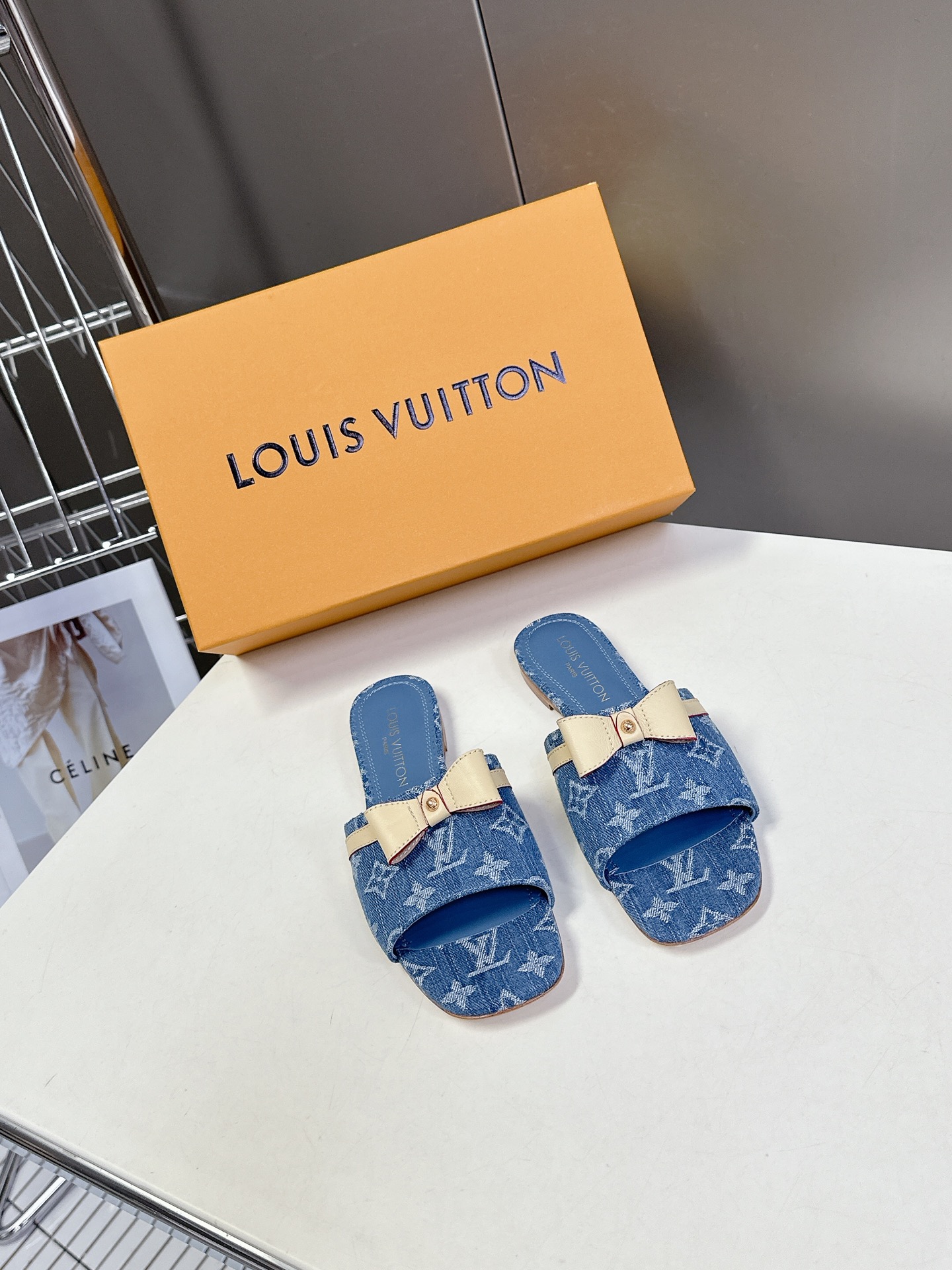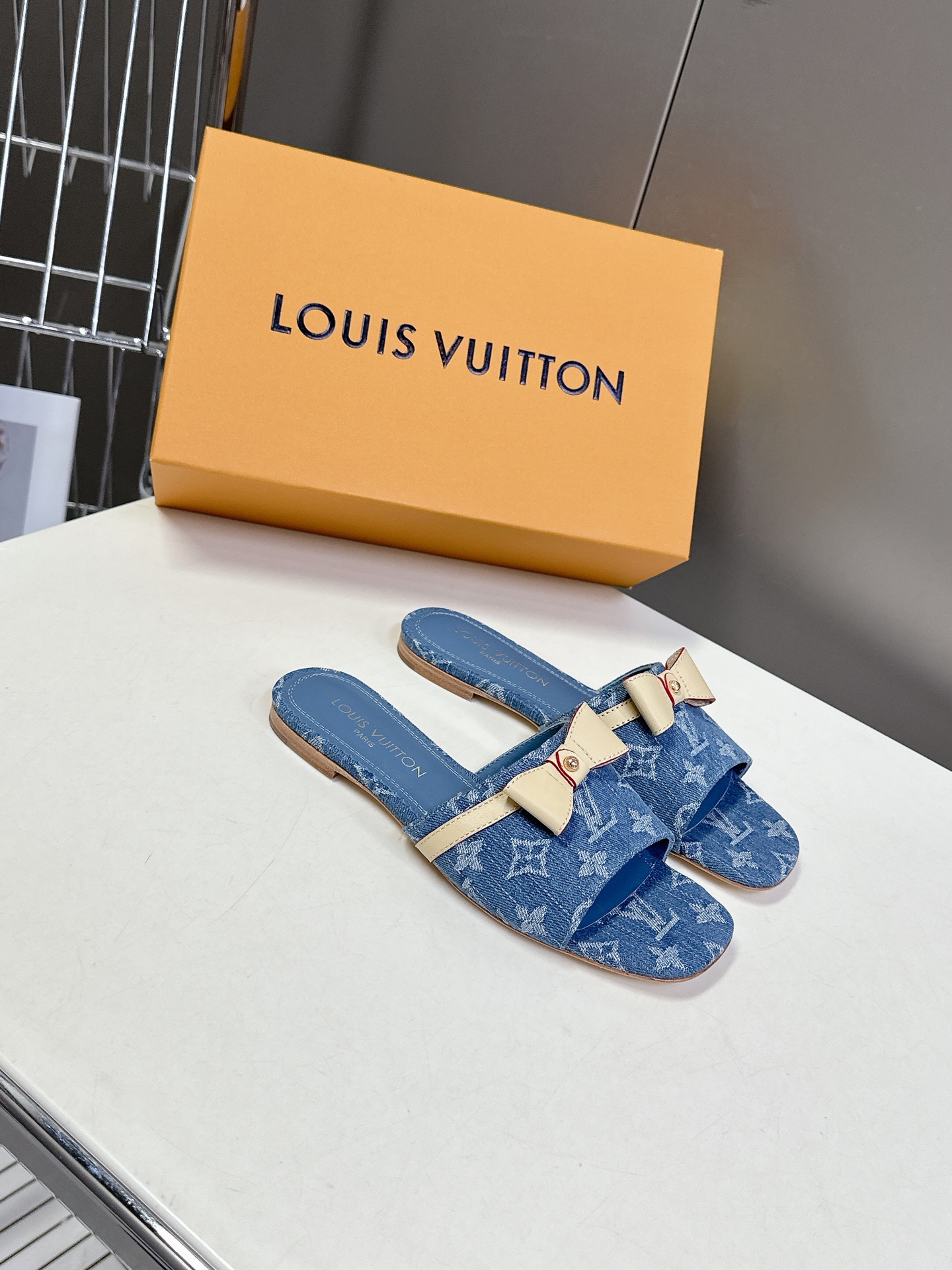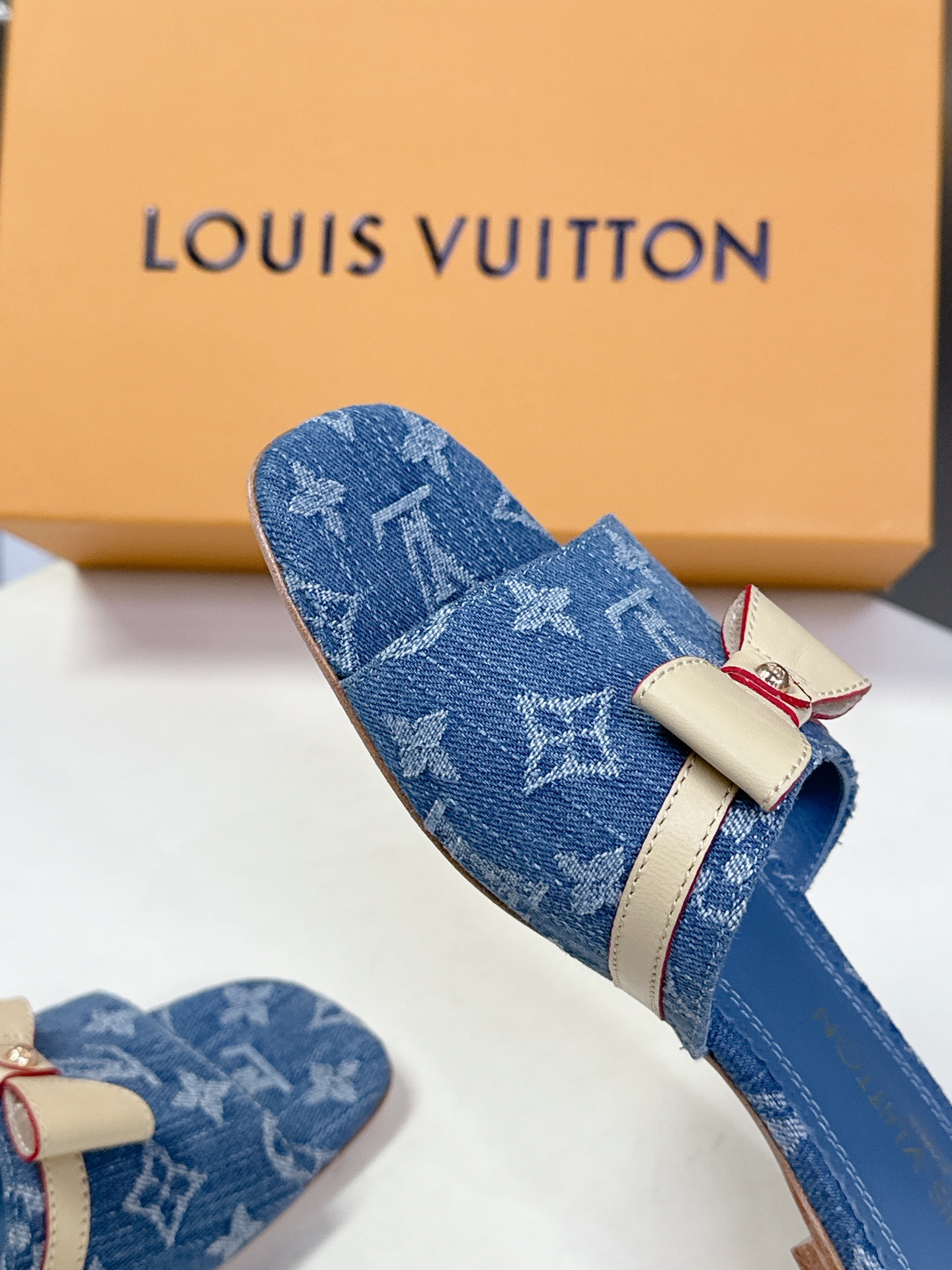 LOUIS VUITTON LV DENIM BOW SLIDES BLUE CALFSKIN LEATHER SANDALS MASTER QUALITY