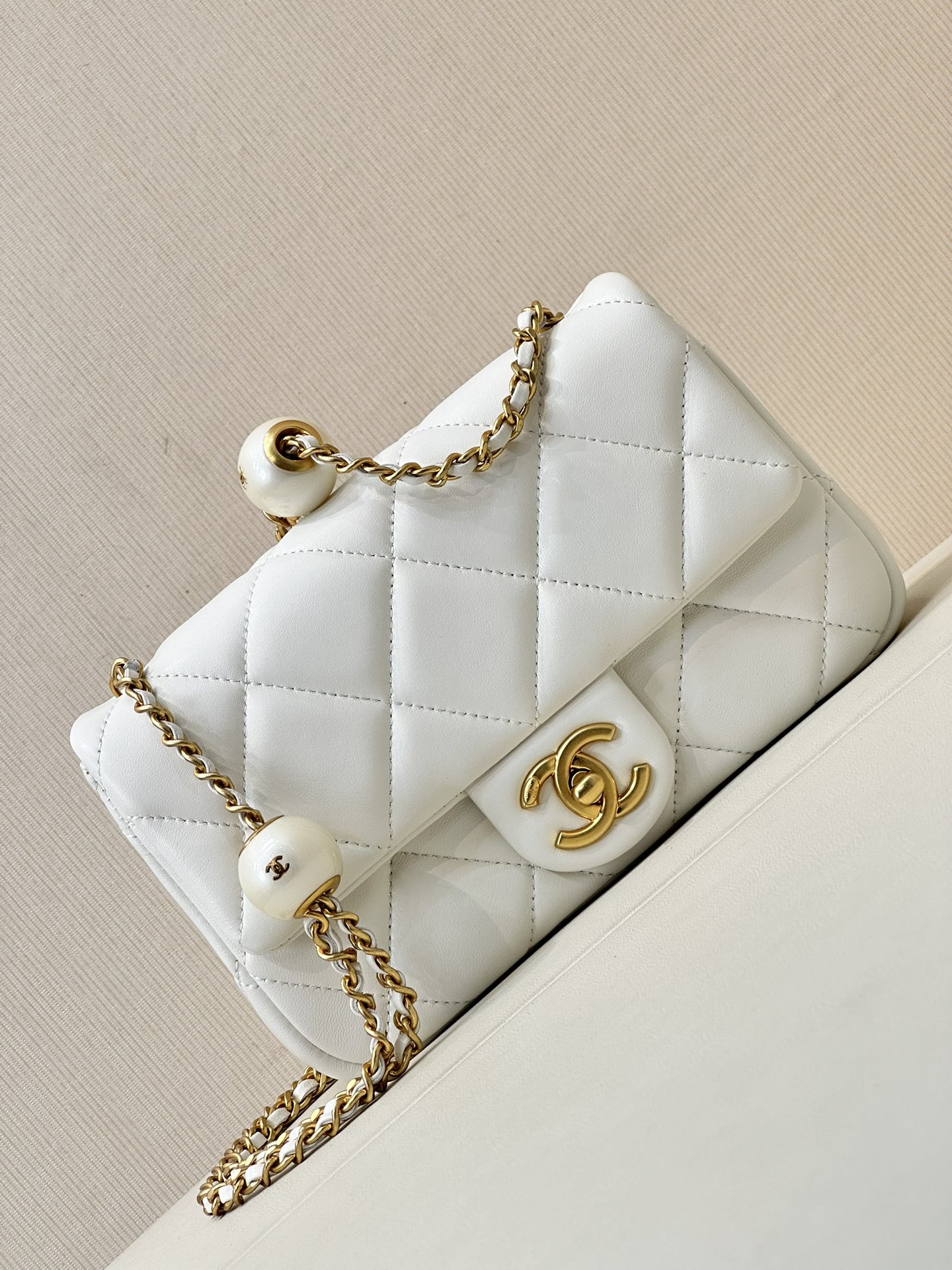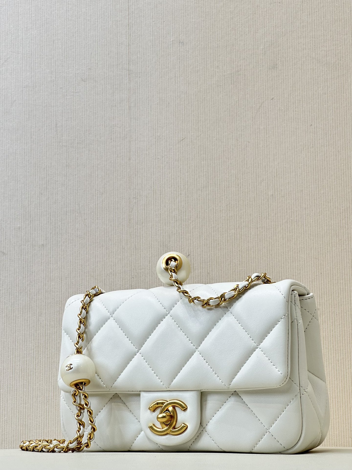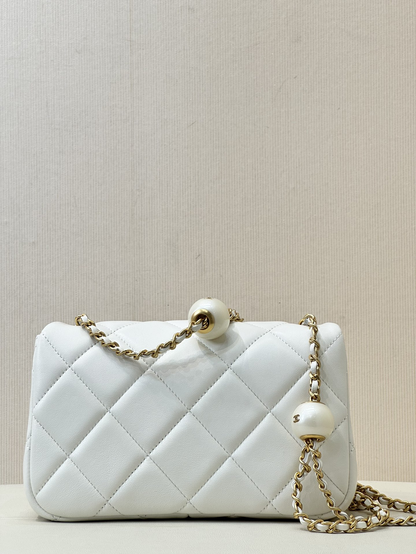 CHANEL MINI FLAP BAG LAMBSKIN, IMITATION PEARLS & GOLD-TONE METAL WHITE FLAP MINI BAG 17×11×6CM MASTER QUALITY