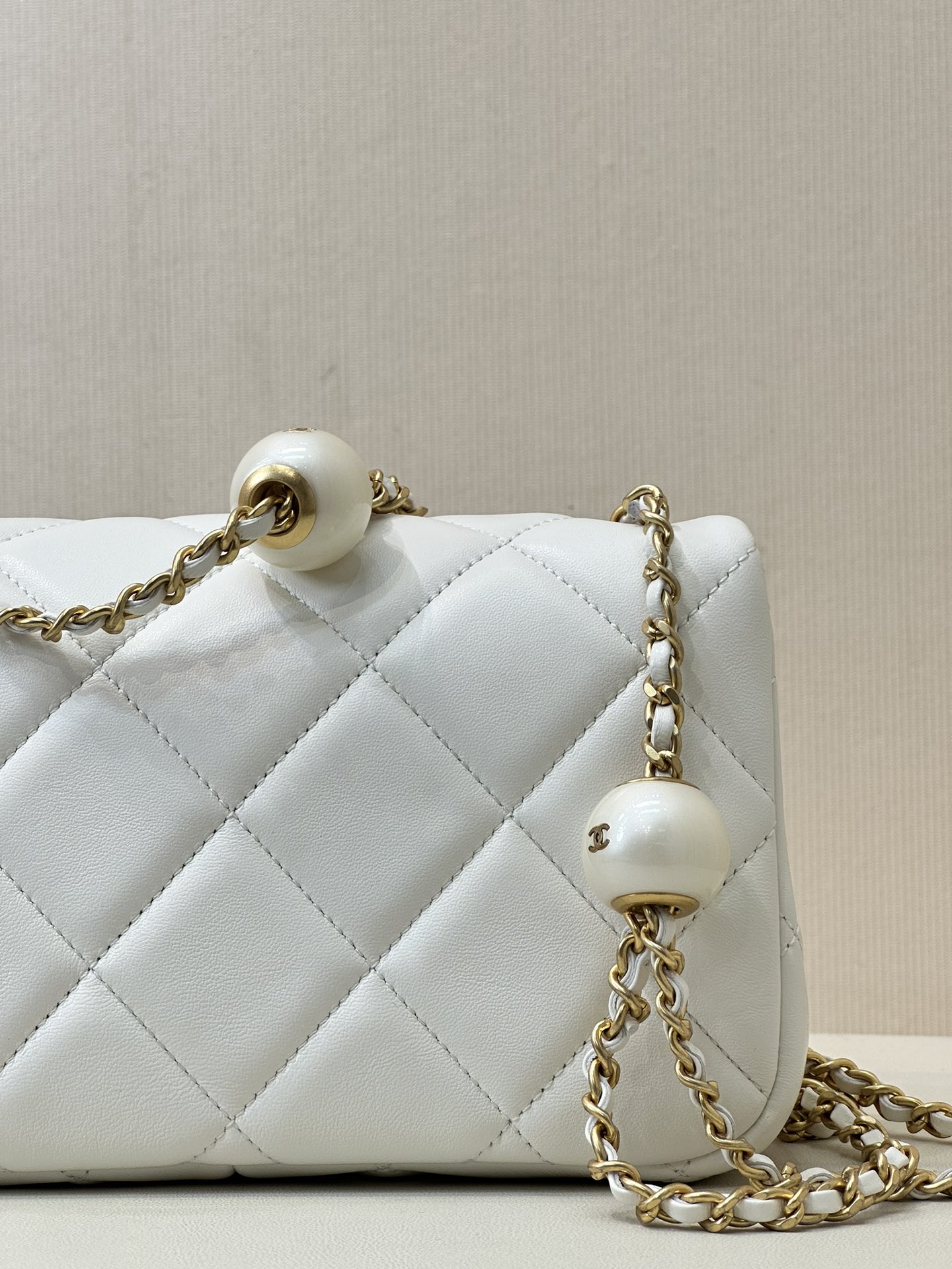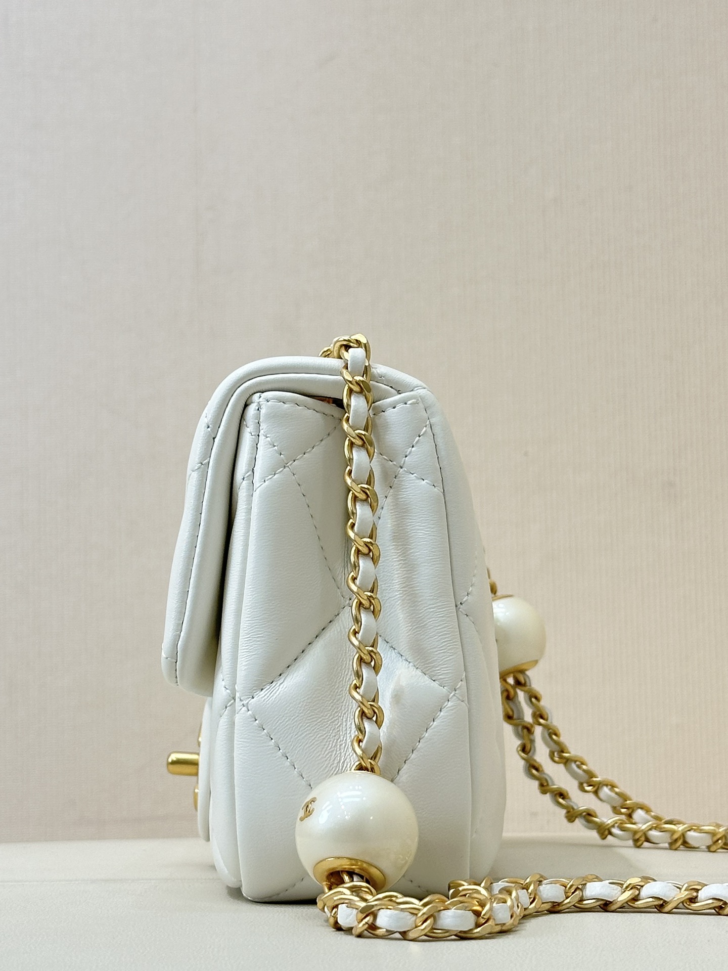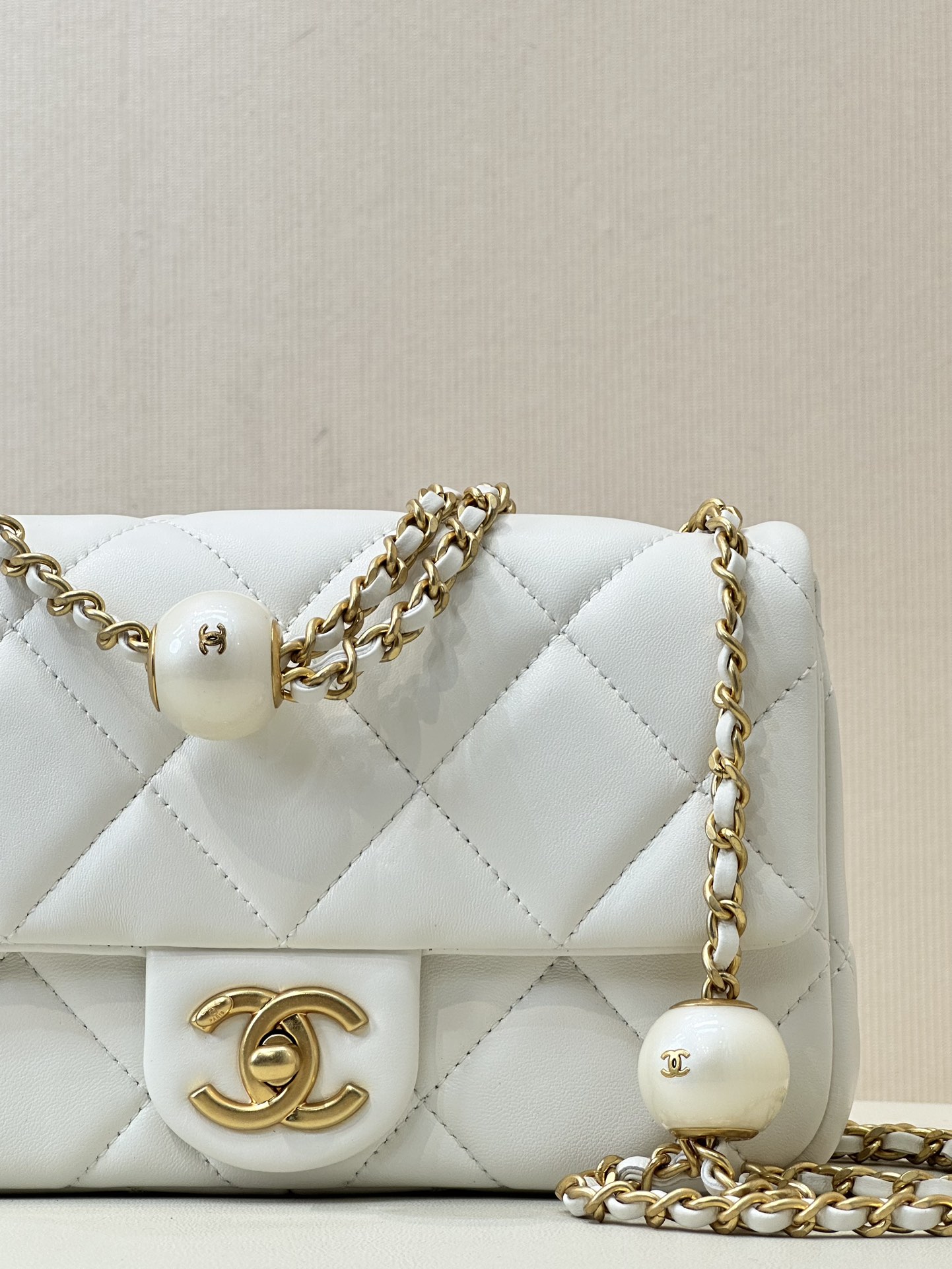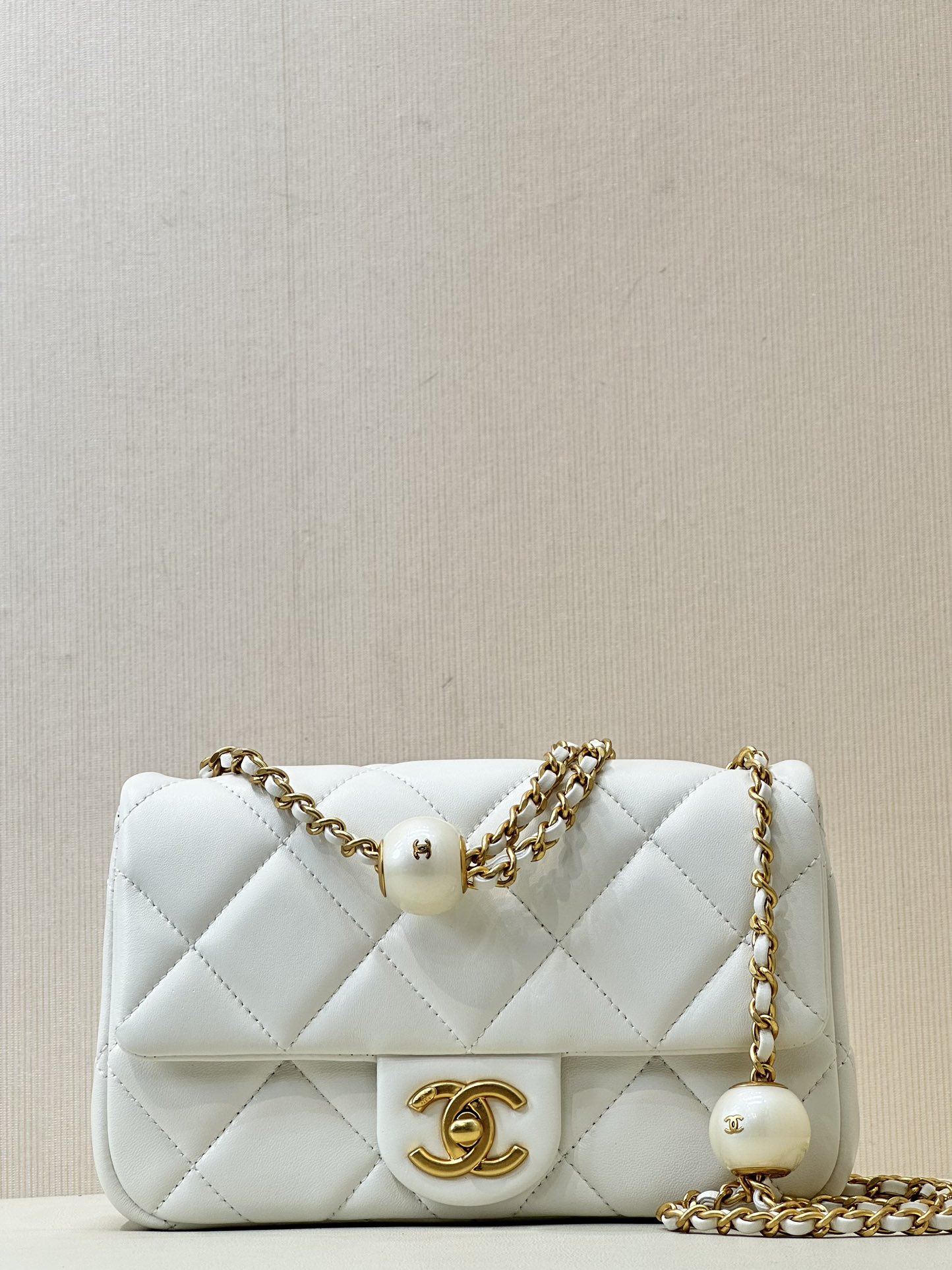 CHANEL MINI FLAP BAG LAMBSKIN, IMITATION PEARLS & GOLD-TONE METAL WHITE FLAP MINI BAG 17×11×6CM MASTER QUALITY