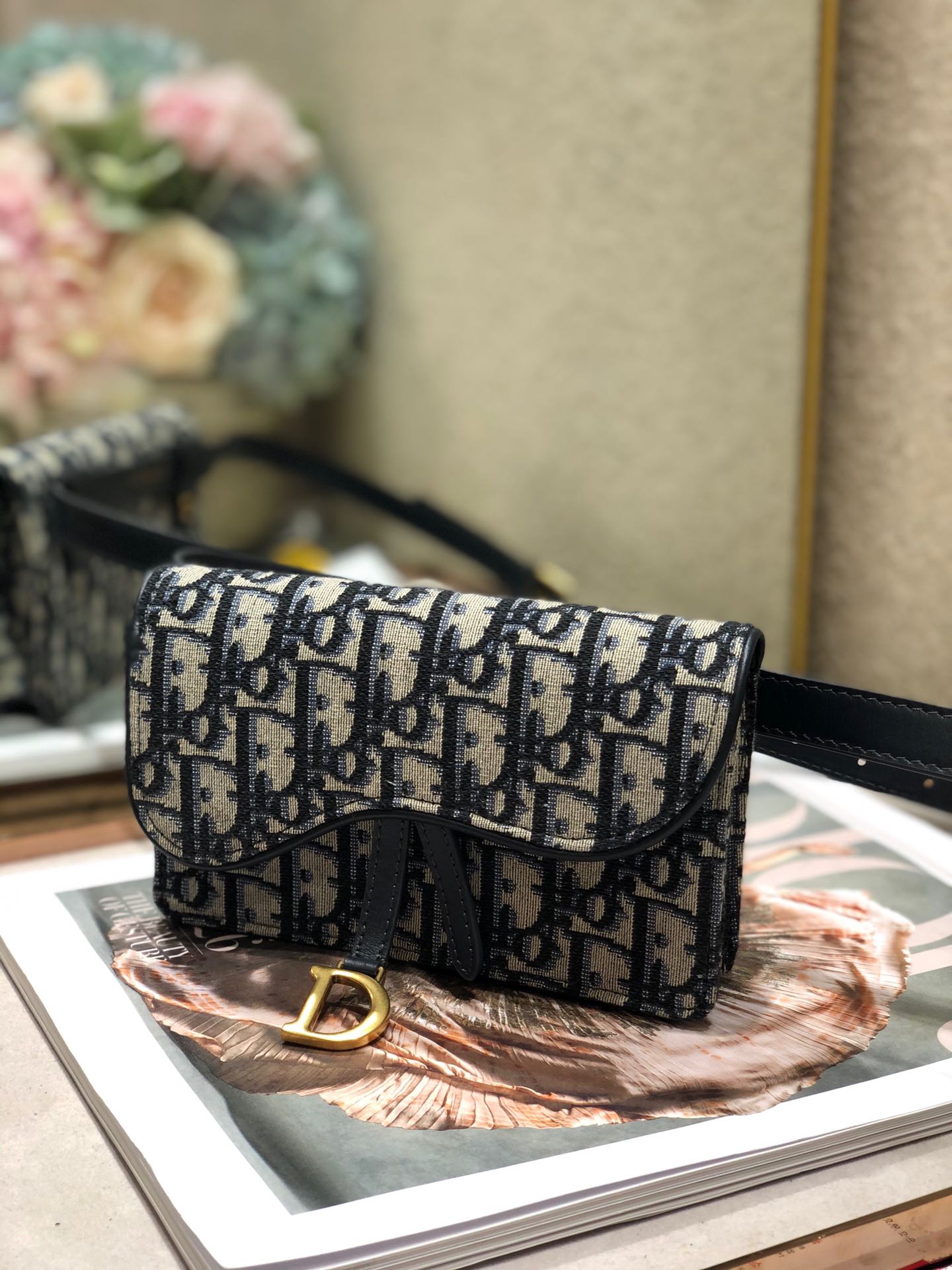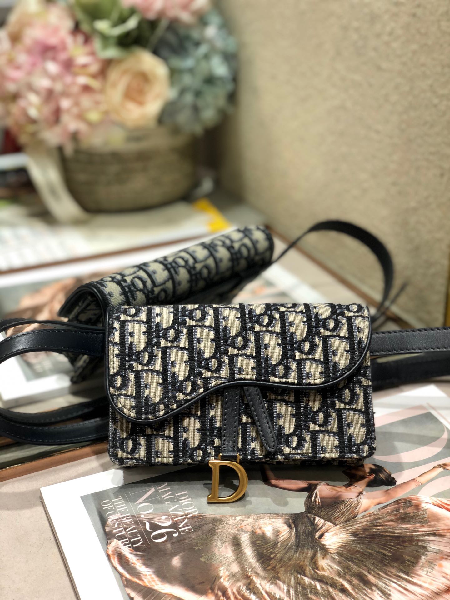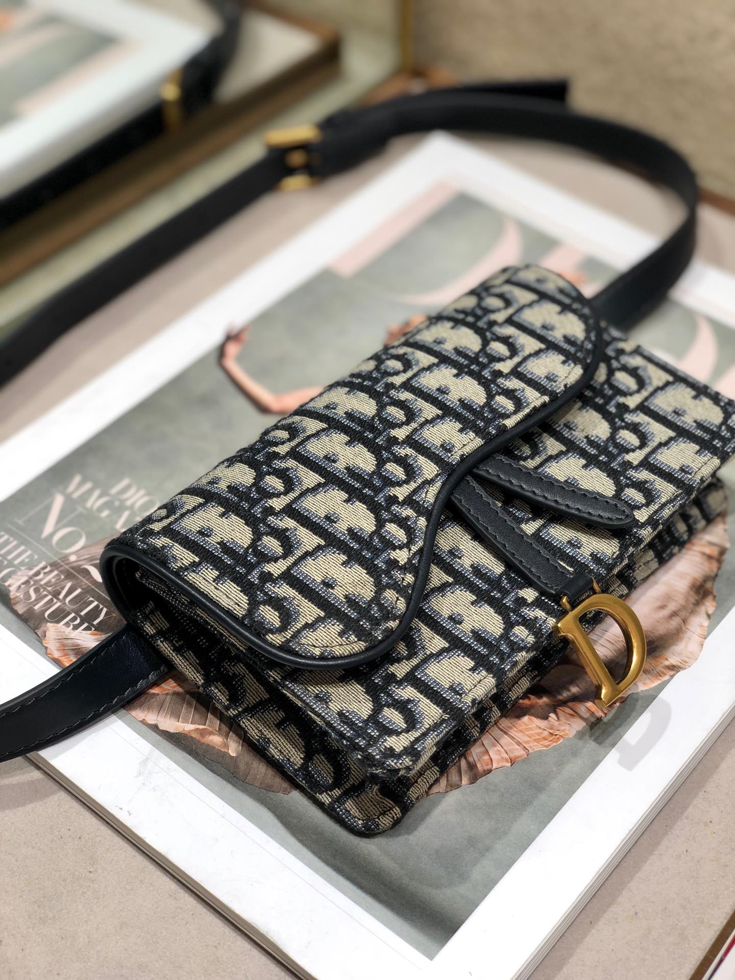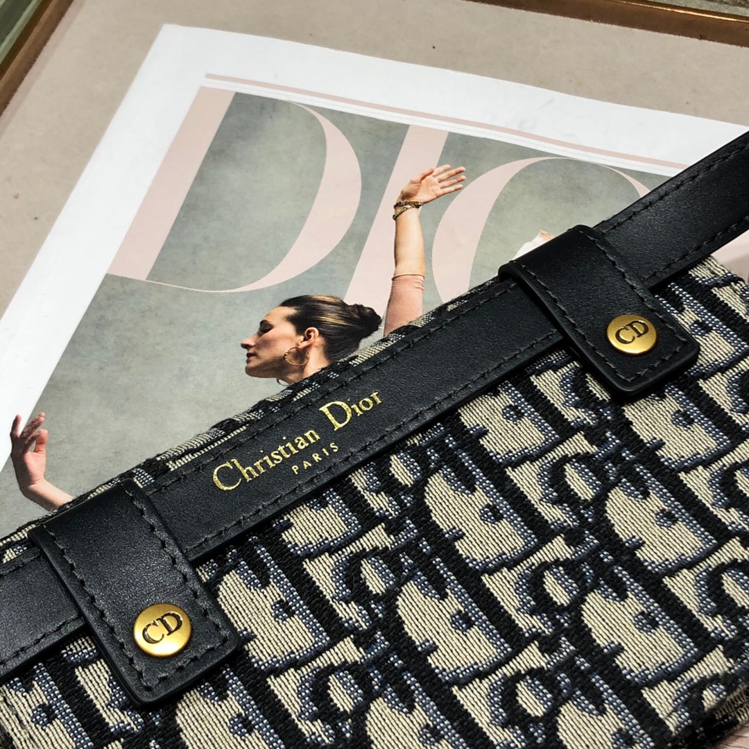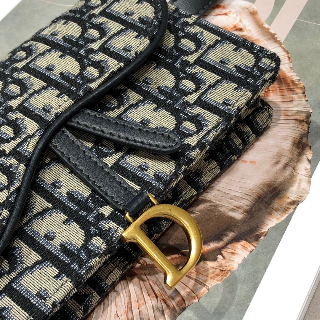 - Crafted in blue Dior Oblique jacquard, it offers a subtle homage to the Saddle line with its flap and metal ‘D’ stirrup magnetic clasp.