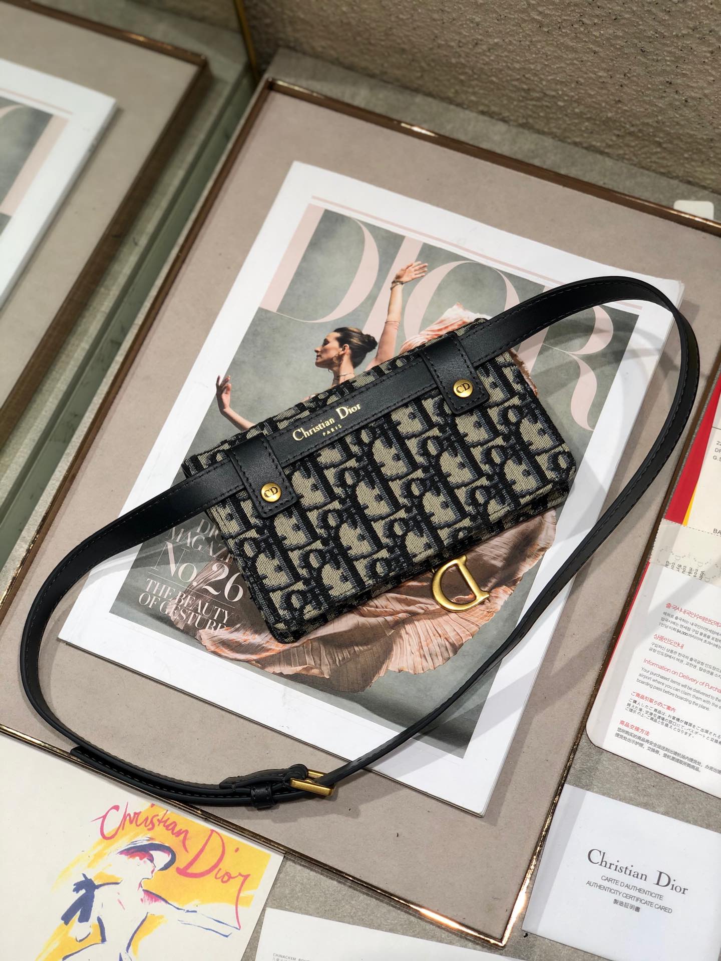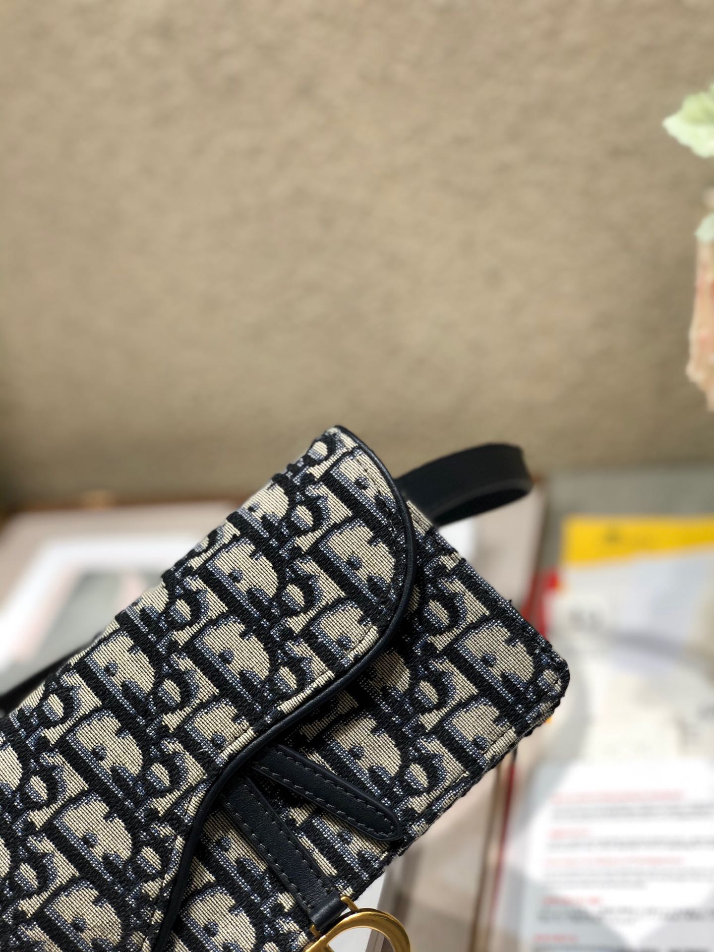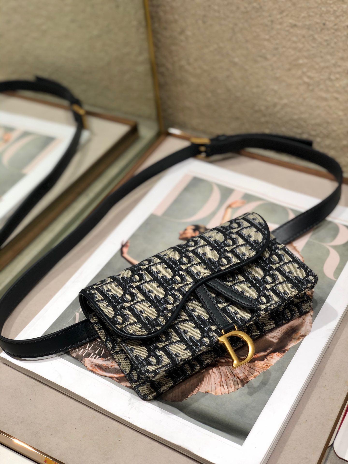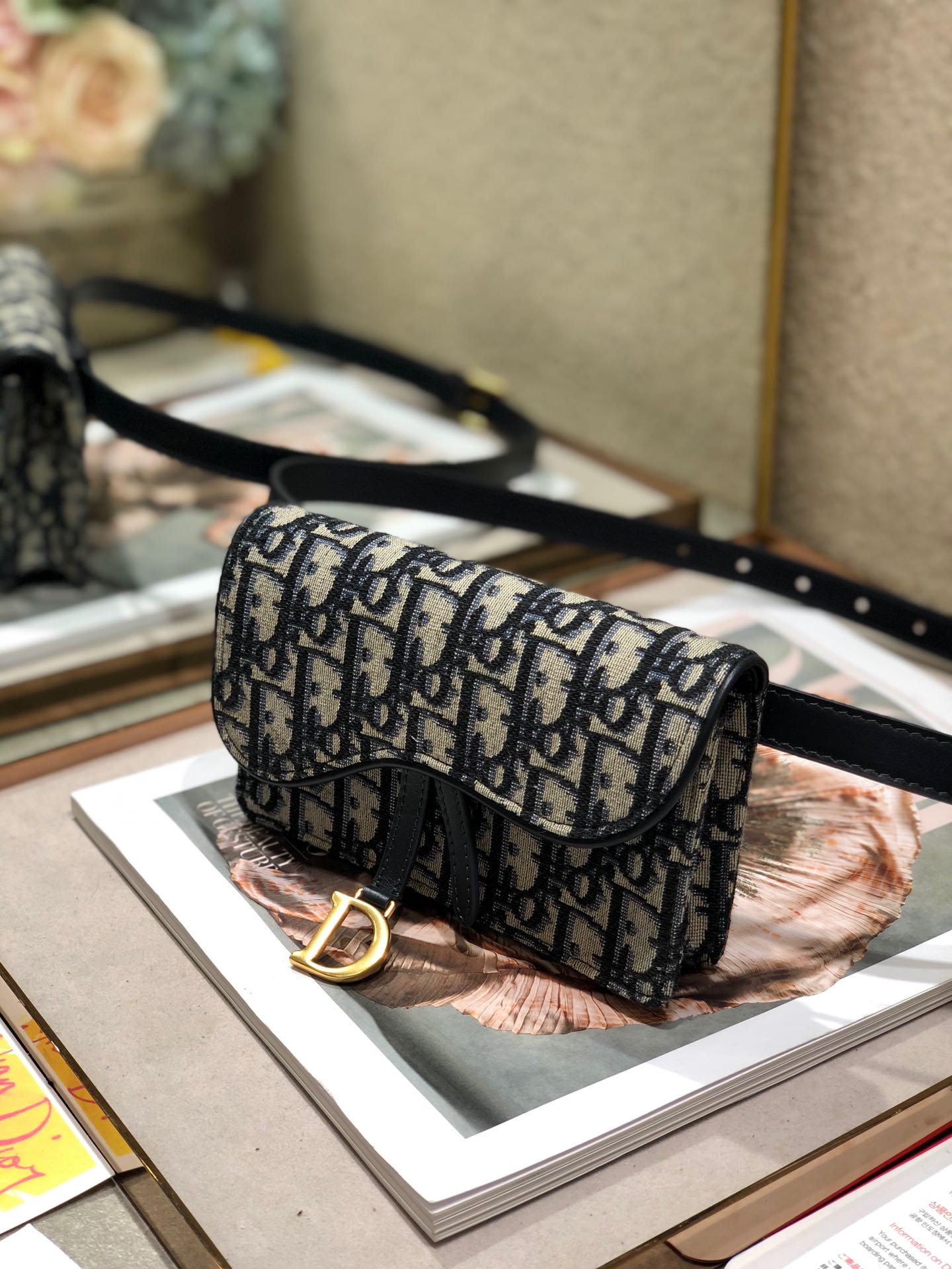 - Crafted in blue Dior Oblique jacquard, it offers a subtle homage to the Saddle line with its flap and metal ‘D’ stirrup magnetic clasp.